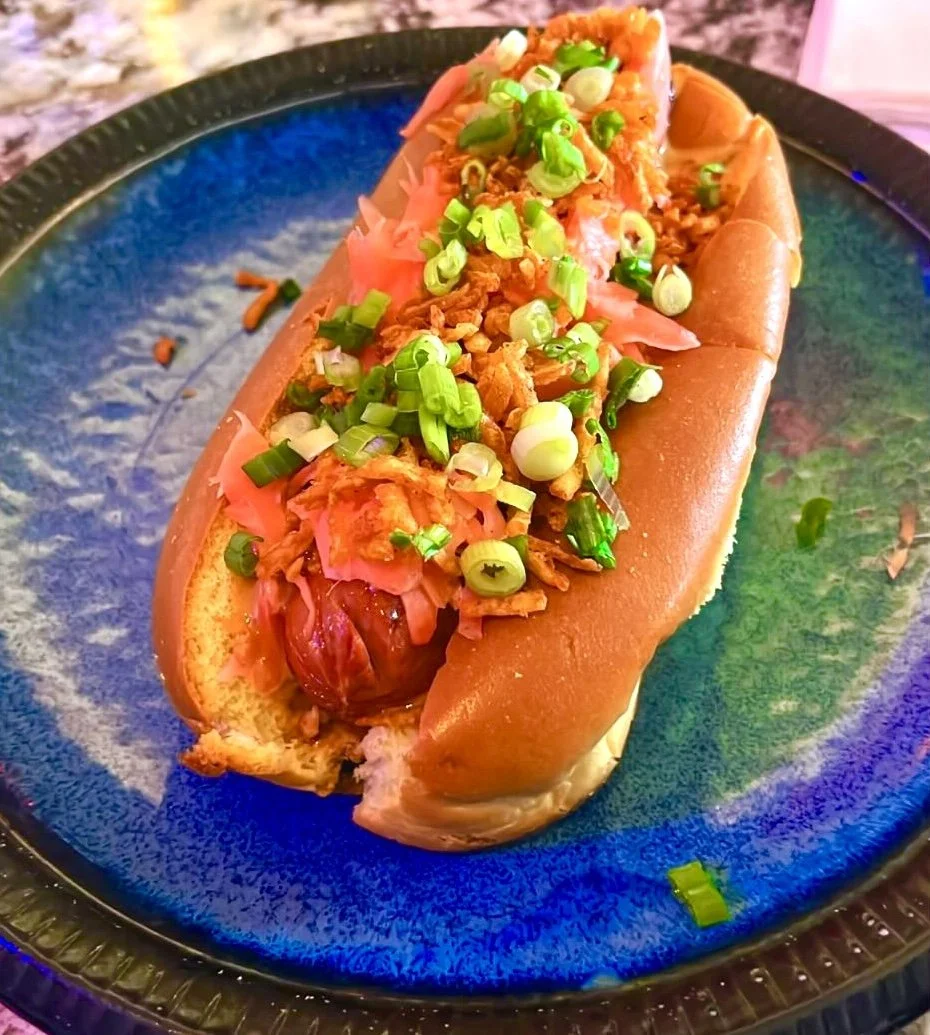 Nathan's all beef dog, brioche bun, chili goma sauce, teriyaki sauce, Cajun potato sticks, pickle ginger, scallions