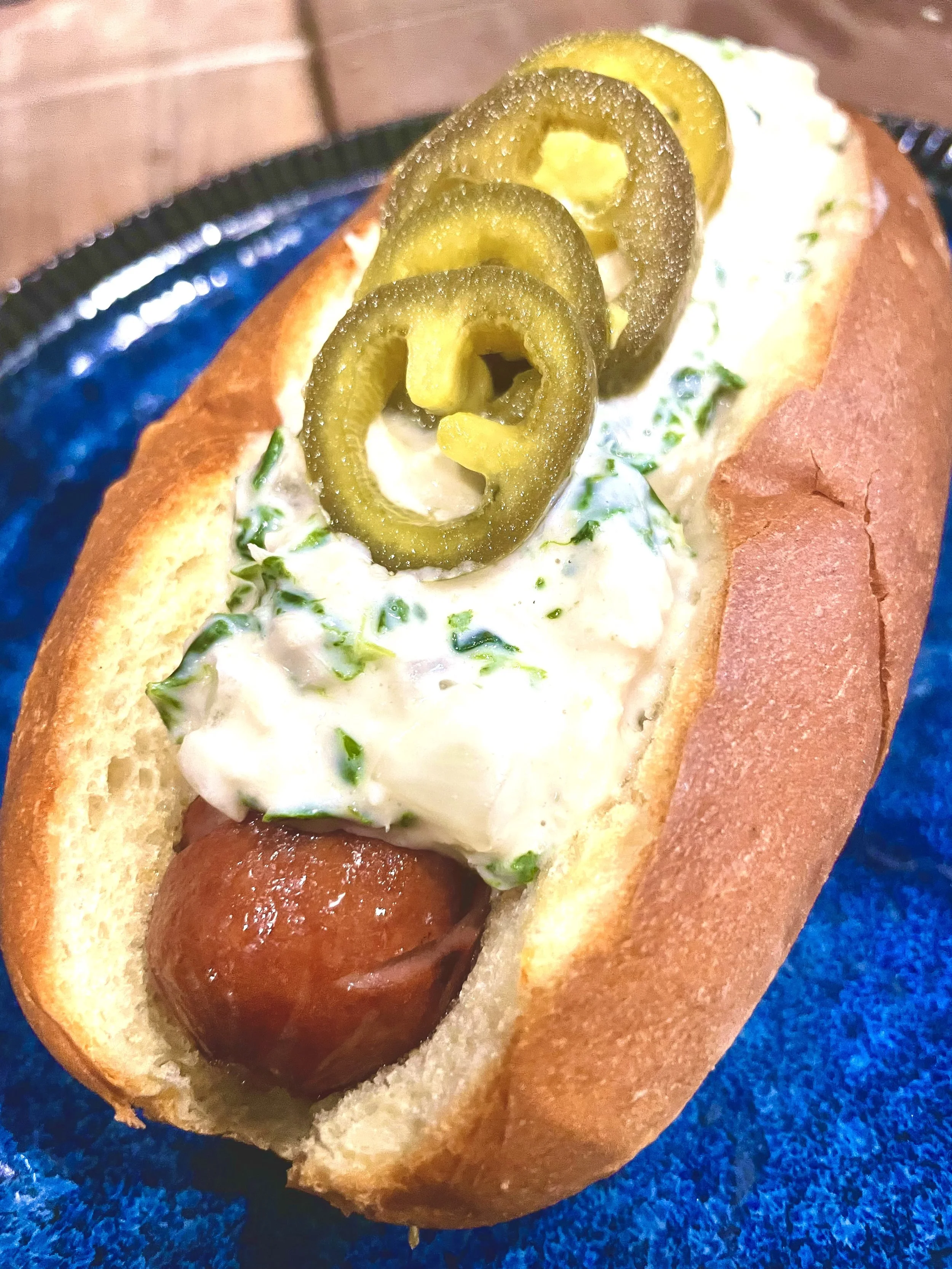 Nathan's all beef dog, brioche bun, crab & spinach cream cheese sauce, pickled jalapeno