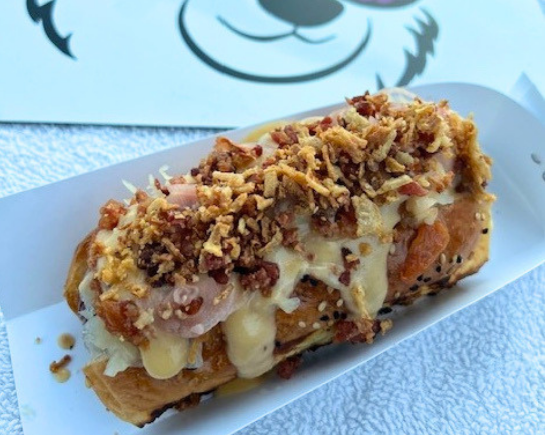 Nathan’s Famous all beef hotdog topped with beer cheese, tomato relish, sauerkraut, pickled shallots, bacon bits, crispy onions
