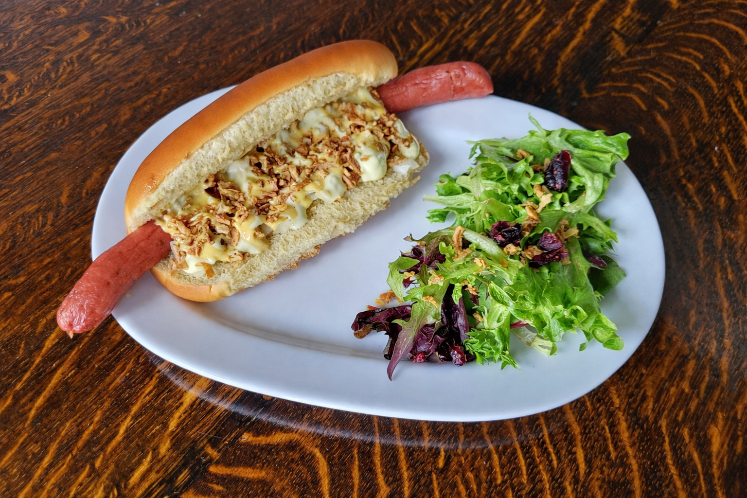 Iceland's most famous street food made with beef, pork and lamb, served with onions, fried onions, Icelandic remoulade and Icelandic brown mustard.