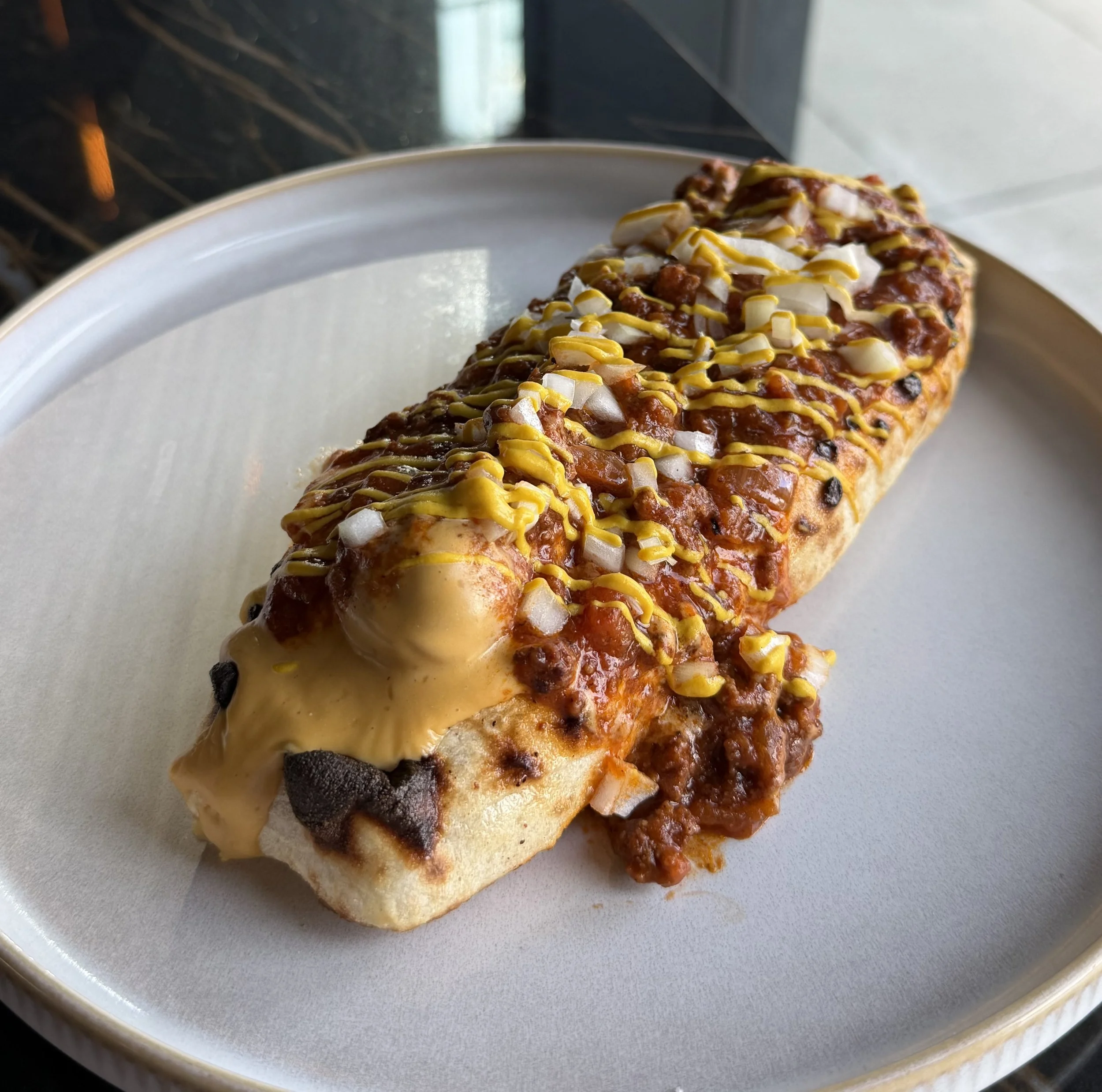 Beef chili with house made jalepeño cheddar sauce on a Nathan's all beef Hot Dog, all cooked in sourdough pizza crust! Topped with onion and mustard!