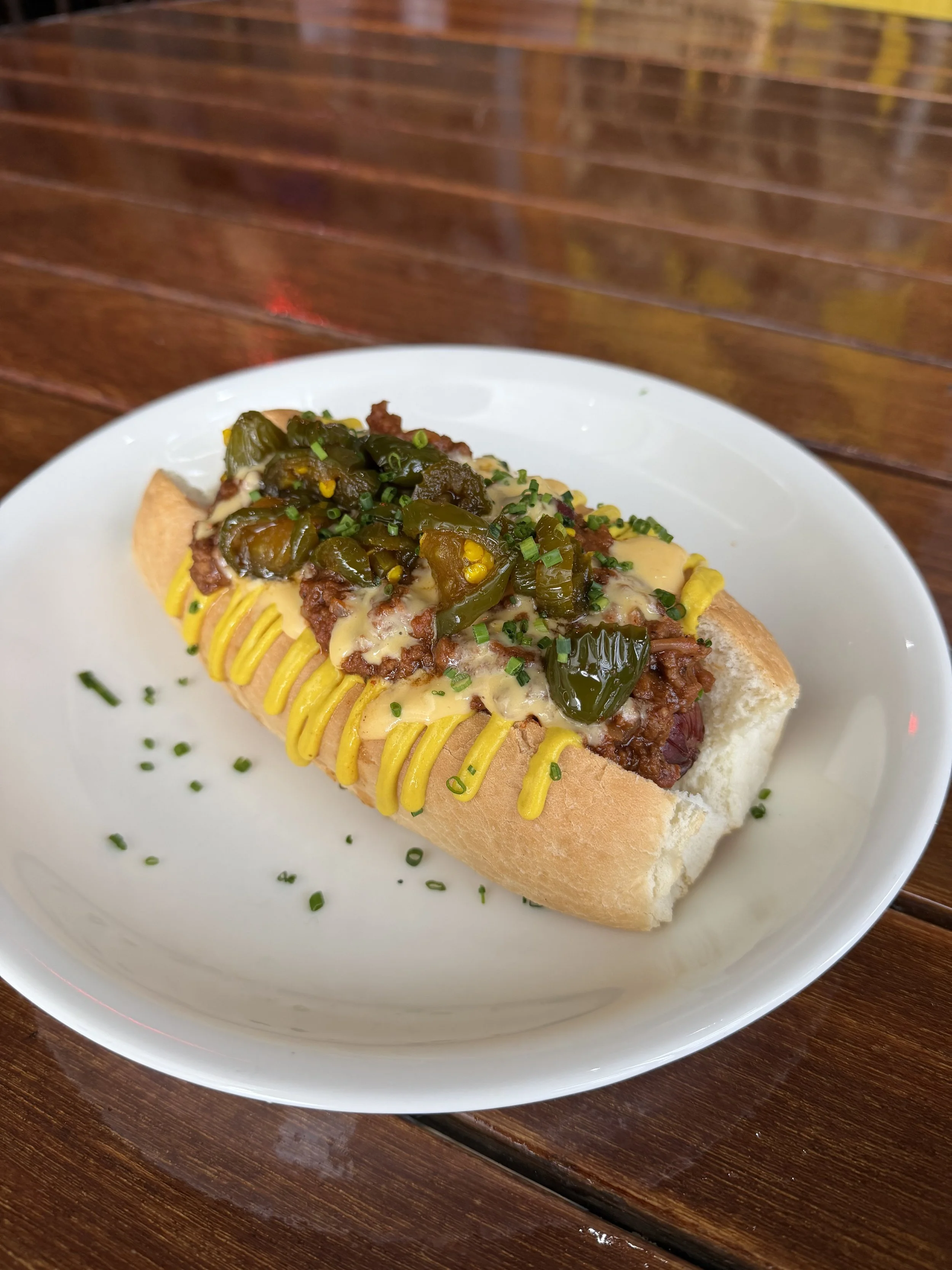 Smoked Hot Dog, Yellow Mustard, Texas Style Chili, Queso, Diced Onion, Cowboy Candy and Chives.